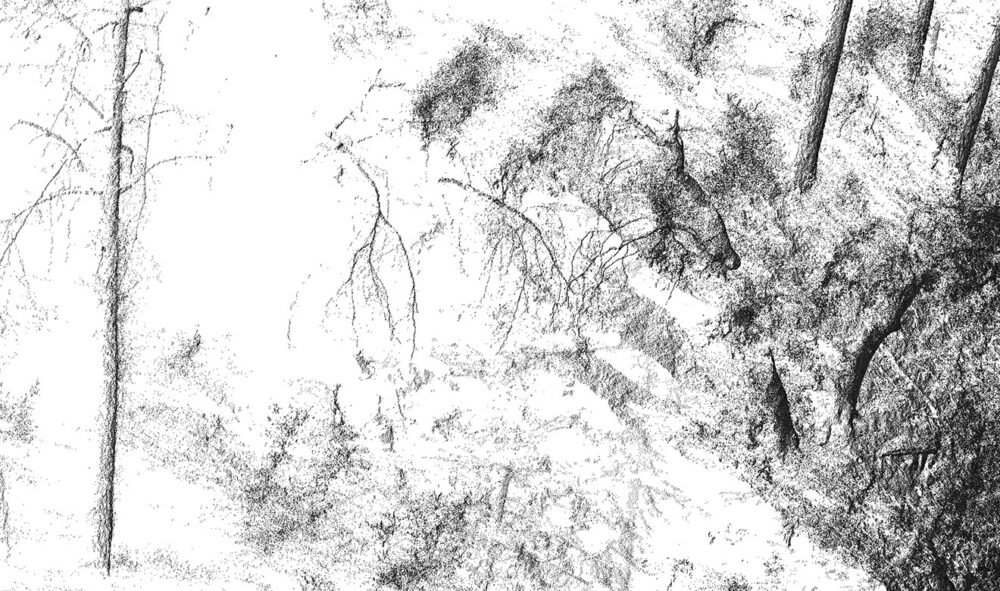Lidar scanning offers a relevant medium for this project. Lidar sprays a laser beam over an area to construct a 3D surface map, known as a point cloud, to produce a digital duplicate of a physical original. Typically, these digital artifacts are exposed to regimes of extraction and analysis to arrive at a high-fidelity copy of the physical original – a matter of documentation and fact. However, if we consider the point cloud prior to such processing, it can emerge as a representational image – a matter of meaning and concern.